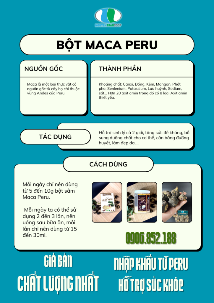 Bột Sâm Maca Peru không chỉ là một nguồn dinh dưỡng phong phú mà còn là một phương tiện tự nhiên hỗ trợ sức khỏe và sinh lý. Với các lợi ích khoa học đã được chứng minh, Maca đang trở thành một sự lựa chọn phổ biến trong việc duy trì một lối sống lành mạnh và cân bằng.  Liên hệ ngay với chúng tôi để biết thêm thông tin chi tiết về sản phẩm!