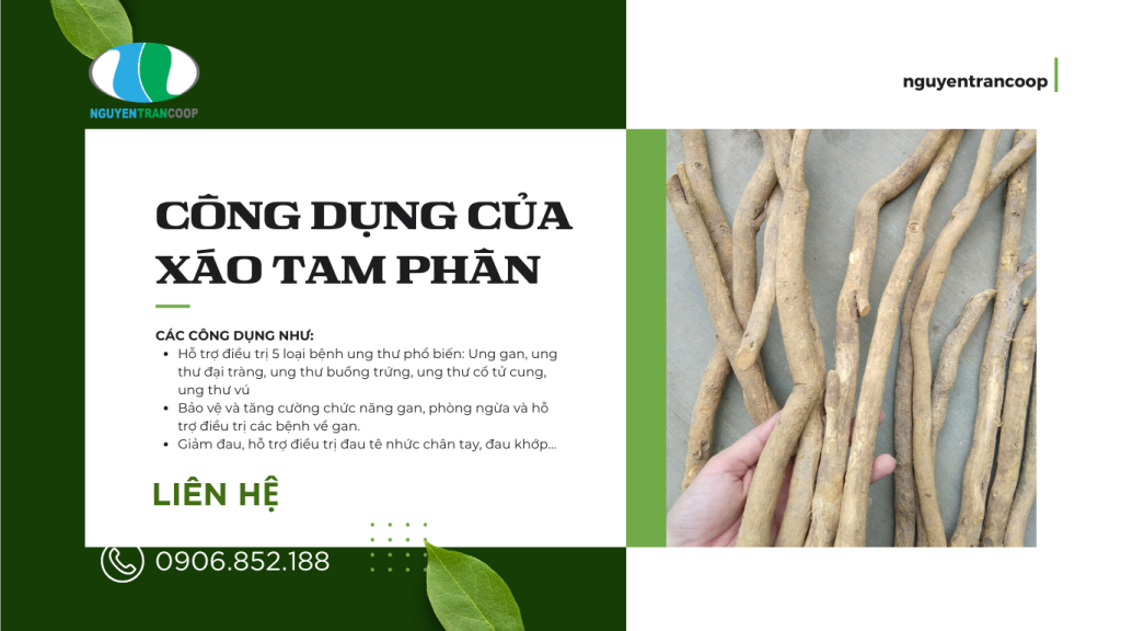 Xáo Tam Phân được công nhận với tác dụng hỗ trợ điều trị nhiều loại bệnh, đặc biệt là trong việc chống lại ung thư. Nghiên cứu của Viện Dược liệu Trung Ương đã chỉ ra rằng Xáo Tam Phân chứa nhiều thành phần quan trọng như Flavonoid, Saponin, Courmarin, Alkaloid, Triterpenoid và chất chống oxy hóa, có tác dụng đặc biệt trong hỗ trợ điều trị ung thư gan, đại tràng, cổ tử cung, buồng trứng và vú.